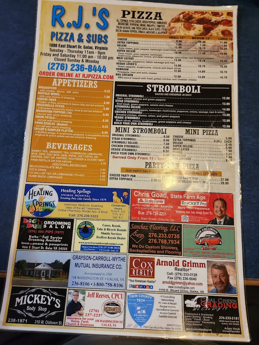 Introducing the delightful menu of R.J.'s Pizza & Subs, a hidden gem located at 1006 E Stuart Dr, Galax, VA. This establishment has earned rave reviews for its extensive selection of Italian cuisine, including mouth-watering pizzas, hearty subs, and savory wings. Customers have praised the flavorful chicken Alfredo and the substantial cheese steak sub, often noting how satisfying the portions are for the price.